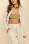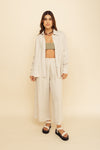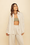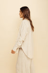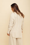 Camisa con fit oversize elaborada en Tejido Plano compuesto de 59% Viscosa, 23% Algodón, 17% Lino y 1% Spandex. La silueta es amplia, tiene botonadura en resina de nácar sobre toda la perilla y puños. Este textil tiene elongación baja, es decir, estira o sede muy poco. También tiene textura liviana y cuenta con muy buena caída.