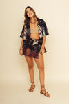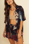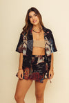Camisa con fit oversize elaborada en SEDA MANGO compuesta de 95% polyester y 5% elastano de 130 gramos con estampación en técnica de sublimación. La silueta es muy amplia, tiene botonadura en resina de coco sobre toda la perilla y puede servirle a hombres y mujeres. Este textil no tiene elongación, es decir, no estira ni sede. También tiene textura liviana, ligera y cuenta con muy buena caída.