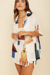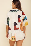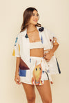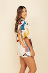 Camisa tipo oversize elaborada en tejido plano apariencia lino 100% poliéster de 140 gramos con estampación en técnica de sublimación y muy suave al tacto. La silueta es muy amplia tipo oversize unisex, tiene botonadura en resina de coco en toda la perilla y mangas anchas. Este textil no tiene elongación, es decir qué no estira, tiene textura liviana, ligera y con muy buena caída.
