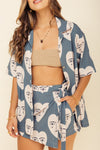 Camisa tipo oversize elaborada en Seda compuesta de 95% polyester y 5% elastano de 130 gramos con estampación en técnica de sublimación. La silueta es muy amplia tipo oversize unisex, tiene botonadura en resina de coco en toda la perilla y mangas anchas. Este textil no tiene elongación, es decir qué no estira, tiene textura liviana, ligera y con muy buena caída.