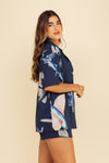 Camisa con fit oversize elaborada en SEDA MANGO compuesta de 95% polyester y 5% elastano de 130 gramos con estampación en técnica de sublimación. La silueta es muy amplia, tiene botonadura en resina de coco sobre toda la perilla y puede servirle a hombres y mujeres. Este textil no tiene elongación, es decir, no estira ni sede. También tiene textura liviana, ligera y cuenta con muy buena caída.