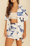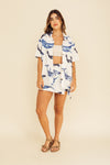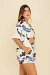 Camisa con fit oversize elaborada en SEDA MANGO compuesta de 95% polyester y 5% elastano de 130 gramos con estampación en técnica de sublimación. La silueta es muy amplia, tiene botonadura en resina de coco sobre toda la perilla y puede servirle a hombres y mujeres. Este textil no tiene elongación, es decir, no estira ni sede. También tiene textura liviana, ligera y cuenta con muy buena caída.