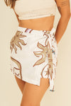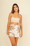 Falda short tiro medio elaborada en tejido plano apariencia lino 100% poliéster de 140 gramos con estampación en técnica de sublimación y muy suave al tacto. Tiene caída ligera y liviana. La silueta es semi amplía con posibilidad de ajustarla con cinturón sobrepuesto en la parte frontal.