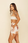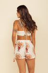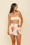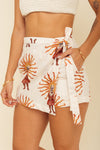 Falda short tiro medio elaborada en tejido plano apariencia lino 100% poliéster de 140 gramos con estampación en técnica de sublimación y muy suave al tacto. Tiene caída ligera y liviana. La silueta es semi amplía con posibilidad de ajustarla con cinturón sobrepuesto en la parte frontal.
