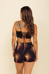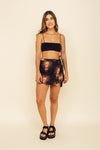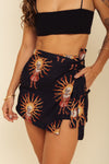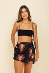 Falda short tiro medio elaborada en tejido plano apariencia lino 100% poliéster de 140 gramos con estampación en técnica de sublimación y muy suave al tacto. Tiene caída ligera y liviana. La silueta es semi amplía con posibilidad de ajustarla con cinturón sobrepuesto en la parte frontal.