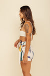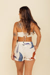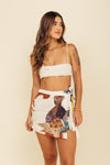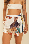 Falda short tiro medio elaborada en tejido plano apariencia lino 100% poliéster de 140 gramos con estampación en técnica de sublimación y muy suave al tacto. Tiene caída ligera y liviana. La silueta es semi amplía con posibilidad de ajustarla con cinturón sobrepuesto en la parte frontal.