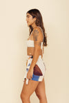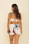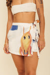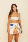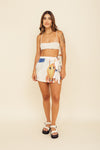 Falda short tiro medio elaborada en tejido plano apariencia lino 100% poliéster de 140 gramos con estampación en técnica de sublimación y muy suave al tacto. Tiene caída ligera y liviana. La silueta es semi amplía con posibilidad de ajustarla con cinturón sobrepuesto en la parte frontal.