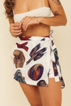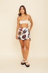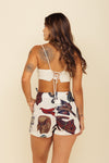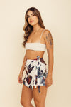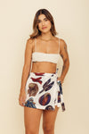Falda short tiro medio elaborada en tejido plano apariencia lino 100% poliéster de 140 gramos con estampación en técnica de sublimación y muy suave al tacto. Tiene caída ligera y liviana. La silueta es semi amplía con posibilidad de ajustarla con cinturón sobrepuesto en la parte frontal.
