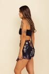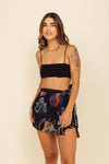 Falda short tiro medio elaborada en tejido plano apariencia lino 100% poliéster de 140 gramos con estampación en técnica de sublimación y muy suave al tacto. Tiene caída ligera y liviana. La silueta es semi amplía con posibilidad de ajustarla con cinturón sobrepuesto en la parte frontal.