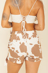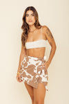 Falda short tiro medio elaborada en en tejido plano o DRILL DLGADO compuesto de 59% Algodón, 3% Spandex y 38% Poliéster con textura muy suave al tacto. Tiene caída media y liviana. La silueta es semi ajustada con posibilidad de ajustarla con cinturón sobrepuesto en la parte fronta.