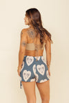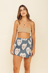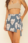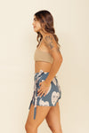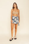Falda short tiro medio elaborada en Seda compuesta de 95% polyester y 5% elastano de 130 gramos con estampación en técnica de sublimación. Tiene caída ligera y liviana. La silueta es semi amplía con posibilidad de ajustarla con cinturón sobrepuesto en la parte frontal.