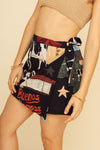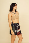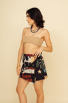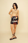Faldashort corta elaborada en SEDA MANGO compuesta de 95% polyester y 5% elastano de 130 gramos con estampación en técnica de sublimación. La silueta es semi ajustada pues es entallada en la parte de la cintura, tiene botón en resina de coco y cierre y capa sobre puesta para anudar en un costado. Este textil no tiene elongación, es decir, no estira ni sede. También tiene textura liviana, ligera y cuenta con muy buena caída.