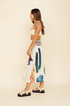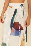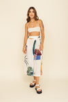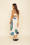 Falda midi elaborada en tejido plano apariencia lino 100% poliéster de 140 gramos con estampación en técnica de sublimación y muy suave al tacto. La caída es ligera y la tela no tiene elongación (es decir qué no estira). La falda tiene silueta wrap around qué se ajusta a medida que desees sobre tu cadera y cintura.