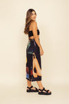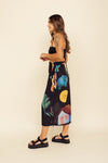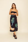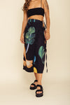 Falda midi elaborada en tejido plano apariencia lino 100% poliéster de 140 gramos con estampación en técnica de sublimación y muy suave al tacto. La caída es ligera y la tela no tiene elongación (es decir qué no estira). La falda tiene silueta wrap around qué se ajusta a medida que desees sobre tu cadera y cintura.
