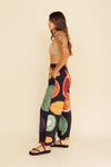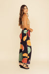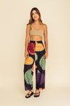 Pantalón tipo “straight” elaborado en SEDA MANGO compuesta de 95% polyester y 5% elastano de 130 gramos con estampación en técnica de sublimación. La silueta es totalmente recta y es más ajustada en la parte de la cintura pues está entallada y es tiro alto. Tiene prenses en la parte superior y en la bota y a pretina está enresortada en la parte de atrás y tiene botón y cierre en la parte frontal.