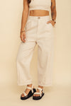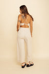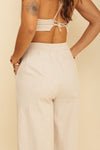 Pantalón tipo “straight” elaborado en Tejido Plano compuesto de 63% Rayón, 36% Lino y 1% Elastómero con tacto suave. La silueta es totalmente recta y es más ajustada en la parte de la cintura pues está entallada y es tiro alto. Tiene prenses en la parte superior y en la bota y a pretina está enresortada en la parte de atrás y tiene botón y cierre en la parte frontal.