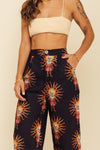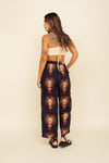 Pantalón elaborado en tejido plano apariencia lino 100% poliéster de 140 gramos con estampación en técnica de sublimación y muy suave al tacto. La pretina está enresortada en la parte de atrás y adelante tiene botón en resina de coco y cremallera y prenses en las botas. La tela tiene poca elongación y la silueta es semi ajustada.