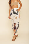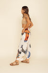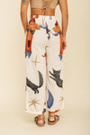 Pantalón elaborado en tejido plano apariencia lino 100% poliéster de 140 gramos con estampación en técnica de sublimación y muy suave al tacto. La pretina está enresortada en la parte de atrás y adelante tiene botón en resina de coco y cremallera y prenses en las botas. La tela tiene poca elongación y la silueta es semi ajustada.