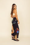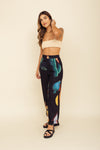 Pantalón elaborado en tejido plano apariencia lino 100% poliéster de 140 gramos con estampación en técnica de sublimación y muy suave al tacto. La pretina está enresortada en la parte de atrás y adelante tiene botón en resina de coco y cremallera y prenses en las botas. La tela tiene poca elongación y la silueta es semi ajustada.