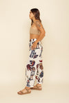 Pantalón elaborado en tejido plano apariencia lino 100% poliéster de 140 gramos con estampación en técnica de sublimación y muy suave al tacto. La pretina está enresortada en la parte de atrás y adelante tiene botón en resina de coco y cremallera y prenses en las botas. La tela tiene poca elongación y la silueta es semi ajustada.