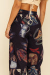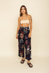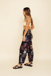 Pantalón elaborado en tejido plano apariencia lino 100% poliéster de 140 gramos con estampación en técnica de sublimación y muy suave al tacto. La pretina está enresortada en la parte de atrás y adelante tiene botón en resina de coco y cremallera y prenses en las botas. La tela tiene poca elongación y la silueta es semi ajustada.