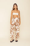 Enterizo elaborado en tejido plano o DRILL DLGADO compuesto de 59% Algodón, 3% Spandex y 38% Poliéster con textura muy suave al tacto. La caída es ligera y la tela no tiene elongación (es decir qué no estira). La silueta de esta pieza es semi ajustada con bota recta y entallada en la parte de la cintura con tiro alto y doblez en botas.