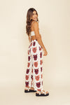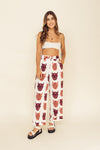 Pantalón elaborado Seda compuesta de 95% polyester y 5% elastano de 130 gramos con estampación en técnica de sublimación. Tiene textura suave al tacto, caída ligera y liviana. La silueta es semi ajustada y entallada en la parte de la cintura (tiro alto) con prenses con la pretina enresortada en la parte posterior y doble botón adelante con cremallera.