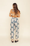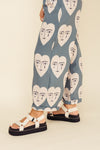 Pantalón elaborado Seda compuesta de 95% polyester y 5% elastano de 130 gramos con estampación en técnica de sublimación. Tiene textura suave al tacto, caída ligera y liviana. La silueta es semi ajustada y entallada en la parte de la cintura (tiro alto) con prenses con la pretina enresortada en la parte posterior y doble botón adelante con cremallera.