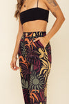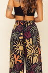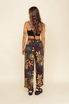Pantalón elaborado Seda compuesta de 95% polyester y 5% elastano de 130 gramos con estampación en técnica de sublimación. Tiene textura suave al tacto, caída ligera y liviana. La silueta es semi ajustada y entallada en la parte de la cintura (tiro alto) con prenses con la pretina enresortada en la parte posterior y doble botón adelante con cremallera.