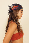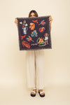 Pañoleta elaborada en Seda compuesta de 95% polyester y 5% elastano de 130 gramos con estampación en técnica de sublimación. Es un recuadro con medidas de 60 centímetros por 60 centímetros aproximadamente qué puede usarse como bandana o accesorio.