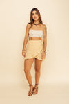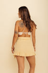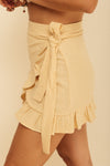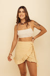 Minifalda tipo pareo elaborada en Tejido Plano texturizado compuesto de 100% algodón con textura suave al tacto. Esta falda se ajusta a la cintura con su silueta wrap around (envuelta) a tu gusto. Este textil no tiene elongación, es decir, no estira ni sede. También tiene textura liviana, ligera y cuenta con muy buena caída.