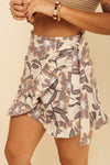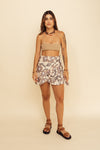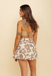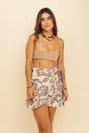 Minifalda tipo pareo elaborada en Tejido Plano compuesta de 96% Algodón y 4% Spandex con tacto muy suave. Esta falda se ajusta a la cintura con su silueta wrap around (envuelta) a tu gusto. Este textil no tiene elongación, es decir, no estira ni sede. También tiene textura liviana, ligera y cuenta con muy buena caída.