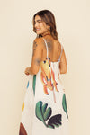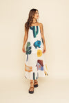 Maxi vestido elaborado tejido plano apariencia lino 100% poliéster de 140 gramos con estampación en técnica de sublimación y muy suave al tacto. La tela no tiene elongación (no estira) y tiene buena caída. La silueta del vestido es muy amplia, tiene apertura en las piernas y cargaderas anudables para ajustar a medida.