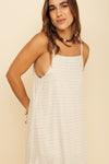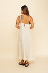 Maxi vestido elaborado en Tejido Plano compuesto de 59% Viscosa, 23% Algodón, 17% Lino y 1% Spandex con textura suave al tacto. Tiene una silueta muy amplia tipo talego y cargaderas ajustables anudadas en la espalda. Este textil tiene elongación baja, es decir, estira o sede muy poco. También tiene textura liviana y cuenta con muy buena caída.