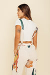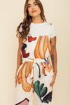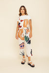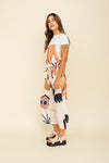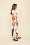 Enterizo elaborado en tejido plano apariencia lino 100% poliéster de 140 gramos con estampación en técnica de sublimación y muy suave al tacto. La caída es ligera y la tela no tiene elongación (es decir qué no estira). La silueta de esta pieza es semi ajustada y cuenta con cargaderas ajustables con botones en resina de coco en la parte posterior y cinturón anudable para usar adelante o atrás para ajustar al cuerpo.
