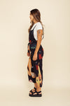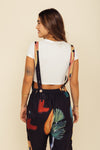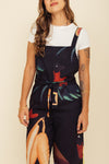 Enterizo elaborado en tejido plano apariencia lino 100% poliéster de 140 gramos con estampación en técnica de sublimación y muy suave al tacto. La caída es ligera y la tela no tiene elongación (es decir qué no estira). La silueta de esta pieza es semi ajustada y cuenta con cargaderas ajustables con botones en resina de coco en la parte posterior y cinturón anudable para usar adelante o atrás para ajustar al cuerpo.