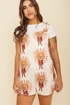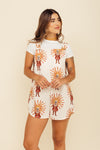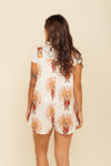 Enterizo corto elaborado en tejido plano apariencia lino 100% poliéster de 140 gramos con estampación en técnica de sublimación y muy suave al tacto. La caída es ligera y la tela no tiene elongación (es decir qué no estira). La silueta es amplia tipo cuadrado y las cargaderas son gruesas con 4 botones en resina de coco para ajustar a medida.