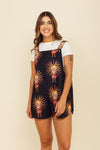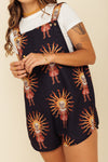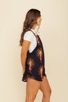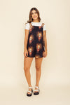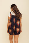 Enterizo corto elaborado en tejido plano apariencia lino 100% poliéster de 140 gramos con estampación en técnica de sublimación y muy suave al tacto. La caída es ligera y la tela no tiene elongación (es decir qué no estira). La silueta es amplia tipo cuadrado y las cargaderas son gruesas con 4 botones en resina de coco para ajustar a medida.