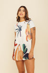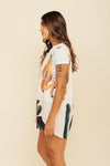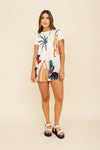 Enterizo corto elaborado en tejido plano apariencia lino 100% poliéster de 140 gramos con estampación en técnica de sublimación y muy suave al tacto. La caída es ligera y la tela no tiene elongación (es decir qué no estira). La silueta es amplia tipo cuadrado y las cargaderas son gruesas con 4 botones en resina de coco para ajustar a medida.