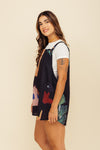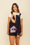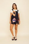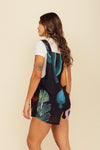 Enterizo corto elaborado en tejido plano apariencia lino 100% poliéster de 140 gramos con estampación en técnica de sublimación y muy suave al tacto. La caída es ligera y la tela no tiene elongación (es decir qué no estira). La silueta es amplia tipo cuadrado y las cargaderas son gruesas con 4 botones en resina de coco para ajustar a medida.