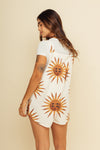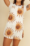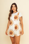 Enterizo corto elaborado en SEDA MANGO compuesta de 95% polyester y 5% elastano de 130 gramos con estampación en técnica de sublimación. La silueta es muy amplia con corte en cuadrado con cargaderas ajustables con botón en resina de coco en los hombros. Este textil no tiene elongación, es decir, no estira ni sede. También tiene textura liviana, ligera y cuenta con muy buena caída.
