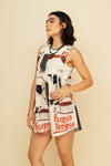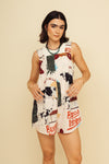 Enterizo corto elaborado en SEDA MANGO compuesta de 95% polyester y 5% elastano de 130 gramos con estampación en técnica de sublimación. La silueta es muy amplia con corte en cuadrado con cargaderas ajustables con botón en resina de coco en los hombros. Este textil no tiene elongación, es decir, no estira ni sede. También tiene textura liviana, ligera y cuenta con muy buena caída.