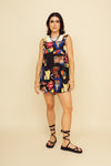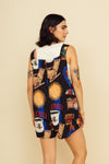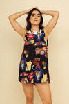 Enterizo corto elaborado en SEDA MANGO compuesta de 95% polyester y 5% elastano de 130 gramos con estampación en técnica de sublimación. La silueta es muy amplia con corte en cuadrado con cargaderas ajustables con botón en resina de coco en los hombros. Este textil no tiene elongación, es decir, no estira ni sede. También tiene textura liviana, ligera y cuenta con muy buena caída.