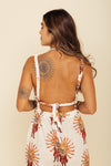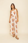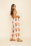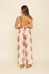 Enterizo elaborado en tejido plano apariencia lino 100% poliéster de 140 gramos con estampación en técnica de sublimación y muy suave al tacto. La caída es ligera y la tela no tiene elongación (es decir qué no estira). La silueta de esta pieza es semi amplia en la parte superior pues tiene cargaderas ajustables en la parte de la espalda y están enresortadas qué se adaptan a medida con nudo.