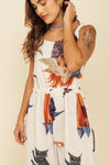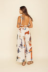 Enterizo elaborado en tejido plano apariencia lino 100% poliéster de 140 gramos con estampación en técnica de sublimación y muy suave al tacto. La caída es ligera y la tela no tiene elongación (es decir qué no estira). La silueta de esta pieza es semi amplia en la parte superior pues tiene cargaderas ajustables en la parte de la espalda y están enresortadas qué se adaptan a medida con nudo.