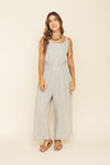 Enterizo elaborado en tejido plano tejido plano compuesto de 70% Rayón Viscosa y 30% Fibras de Lino liviano con textura suave al tacto y efecto semilla. La caída es ligera y la tela no tiene elongación (es decir qué no estira). La silueta de esta pieza es semi ajustada en la parte superior pues tiene cargaderas ajustables en la parte de la espalda y están enresortada, el pantalón es más amplio.