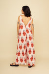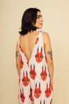 Enterizo largo elaborado en SEDA MANGO compuesta de 95% polyester y 5% elastano de 130 gramos con estampación en técnica de sublimación. La silueta es muy amplia con corte en triángulo (más ancho del busto hacía abajo) con cargaderas ajustables con tensor en los hombros y cuenta con forro/falso a la altura del pecho. Este textil no tiene elongación, es decir, no estira ni sede. También tiene textura liviana, ligera y cuenta con muy buena caída.