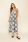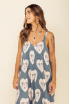 Enterizo corto elaborado en Seda compuesta de 95% polyester y 5% elastano de 130 gramos con estampación en técnica de sublimación. La silueta es muy amplia en corte tipo triángulo, tiene cargaderas ajustables con tensor en los hombros y forro/falso interno a la altura del pecho. Este textil no tiene elongación, es decir qué no estira, tiene textura liviana, ligera y con muy buena caída.