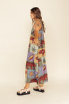 Enterizo corto elaborado en Seda compuesta de 95% polyester y 5% elastano de 130 gramos con estampación en técnica de sublimación. La silueta es muy amplia en corte tipo triángulo, tiene cargaderas ajustables con tensor en los hombros y forro/falso interno a la altura del pecho. Este textil no tiene elongación, es decir qué no estira, tiene textura liviana, ligera y con muy buena caída.