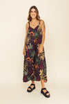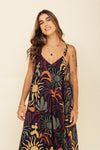 Enterizo corto elaborado en Seda compuesta de 95% polyester y 5% elastano de 130 gramos con estampación en técnica de sublimación. La silueta es muy amplia en corte tipo triángulo, tiene cargaderas ajustables con tensor en los hombros y forro/falso interno a la altura del pecho. Este textil no tiene elongación, es decir qué no estira, tiene textura liviana, ligera y con muy buena caída.
